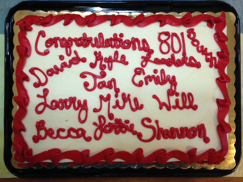 Here is a picture of (most of) the group and the cake we shared at our last small group to celebrate their completion of the first 801South turbo training group. Congrats again!